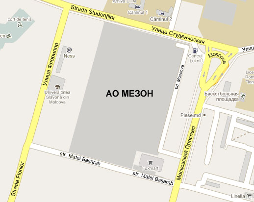 Наш адрес:MD-2068, Молдова, г. Кишинев, Московский пр-т 21, завод Мезон Территория АО «Мезон» находится между Московским проспектом и улицей Флорилор в элитном районе Кишинёва (Рышкановка) с населением около 200 000 человек. АО «Мезон» расположен вблизи большого жилого массива недалеко от трассы, соединяющей Кишинёв со вторым по величине городом Молдовы Бельцы. В непосредственной близости от территории АО «Мезон» располагаются остановки маршрутных такси и общественного транспорта. За 10-15 минут Вы можете оказаться в центре города. ![]() |
